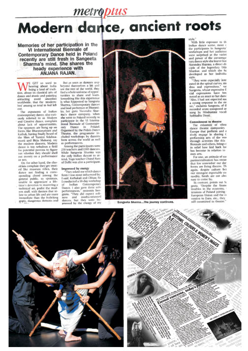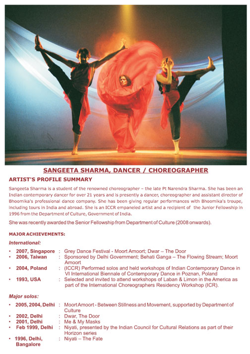 With the soul that is alive to the possibilities of the body and its fullest potential. Sangeeta is able to project her vision of the avant-garde in Indian performing arts in the last decade of the 20th century. —The Pioneer