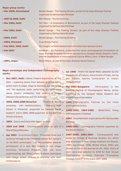 Sangeeta Sharma's modern dance language is comprehensible and colourful. But where is the literature? Not everyone who studies a language can create literature. Sangeeta has certainly what it takes to create literature. —Financial Express